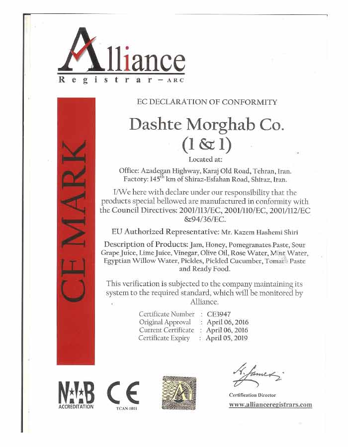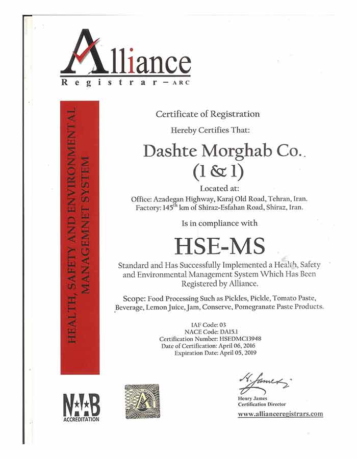 شركت دشت مرغاب با بيش از چهل سال سابقه بعنوان يكي از بزرگترين بنيانگذاران صنعت نوين غذايي كشور ضمن حضور در بازارهاي جهاني با ارج نهادن به نظرات مشتريان و طرفهاي ذينفع، بر اساس الزامات ISO 10002 حفظ و صيانت از محيط زيست و نيروي انساني بعنوان بهترين سرمايه سازمان در راستاي بهبود مستمر و توسعه پايدار علاوه براستقرار سيستمهاي مديريتيISO 9001-2008 ، ISO 22000، ISO 14001-2004، OHSAS 18001-2007 و اخذ گواهينامه ISO 17025 بعنوان آزمايشگاه آكروديته حركت به طرف مديريت جامع كيفيت و خود ارزيابي بر مبناي EFQM را در برنامه كار خود قرار داده است.