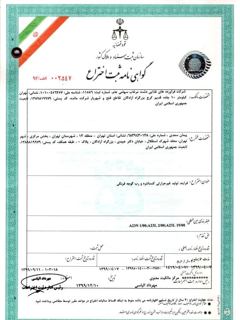 در این اختراع که برای اولین بار در دنیا انجام شده است و به تایید دانشگاه تهران رسیده و ثبت شده است آب گوجه فرنگی بدون هیچگونه انرژی حرارتی از گوجه فرنگی جدا شده و رب یا کنسانتره تولید میشود و